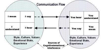 In many ways it is really amazing that we communicate as well as we do. If you look at the chart below, you will see that in a simple two person conversation there are at least 8 points where communication can go wrong. There are at least 4or 5 variables influencing any of those points. And this is only a simple depiction.